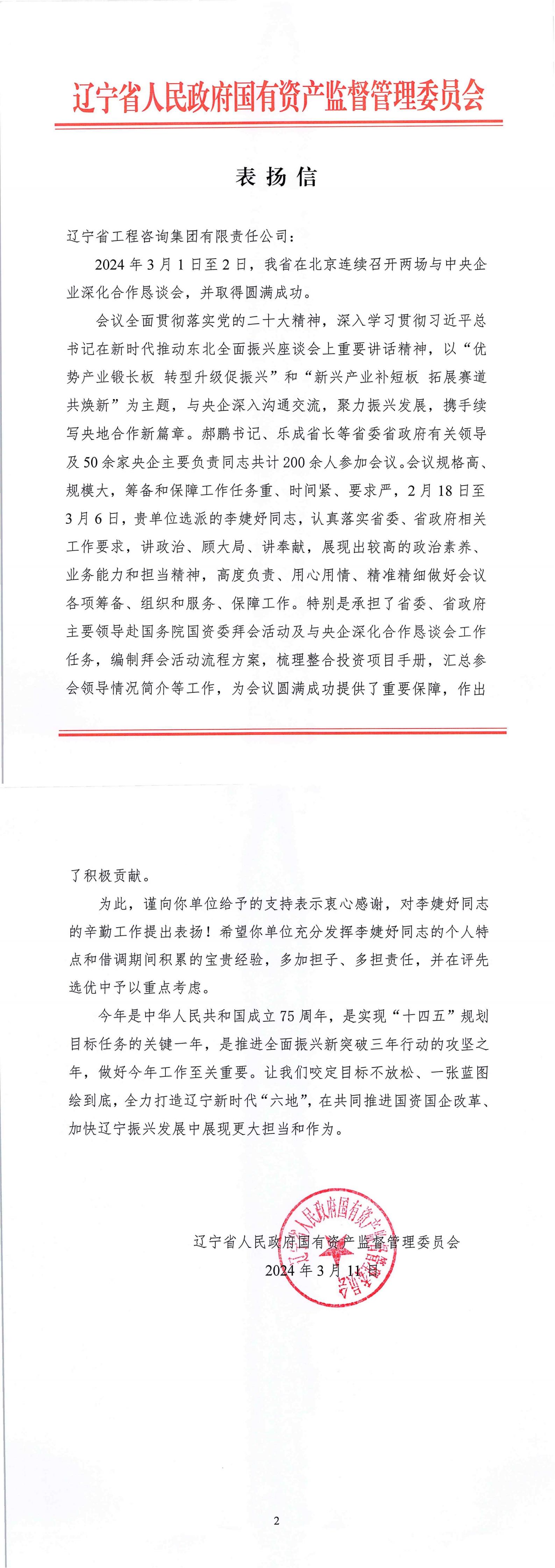 近日,公司收到省國資委發來的表揚信,對我單位李婕妤同志在北京召開的“遼寧省與中央企業深化合作懇談會”上的辛勤工作提出表揚。這是李婕妤同志繼2023年6月25日參與籌備“深化東北地區國資國企改革現場推進會”“國資央企助力東北全面振興座談會”后第二次受到省國資委表揚。